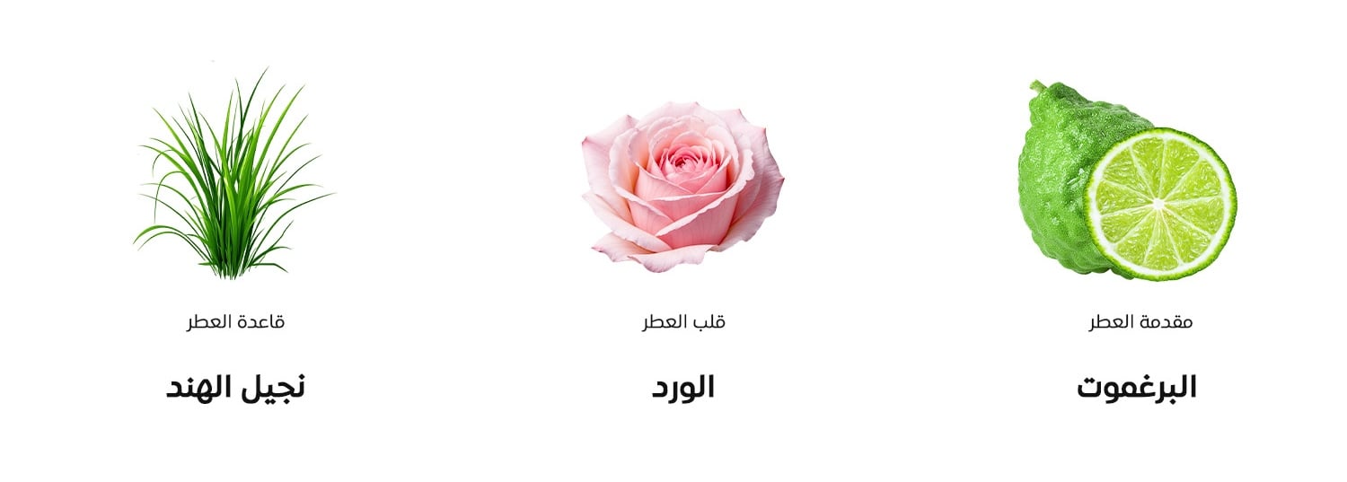 يبدأ العطر بنفحات منعشة مفعمة بالحيوية، حيث يندمج عبق البرغموت المشرق مع دفء الهيل الحار وحيوية الجريب فروت الأخضر. ومع تطوره، يكشف قلبه عن باقة زهرية رائعة من الورد والبنفسج والياسمين، تعبر عن النعومة والجاذبية.